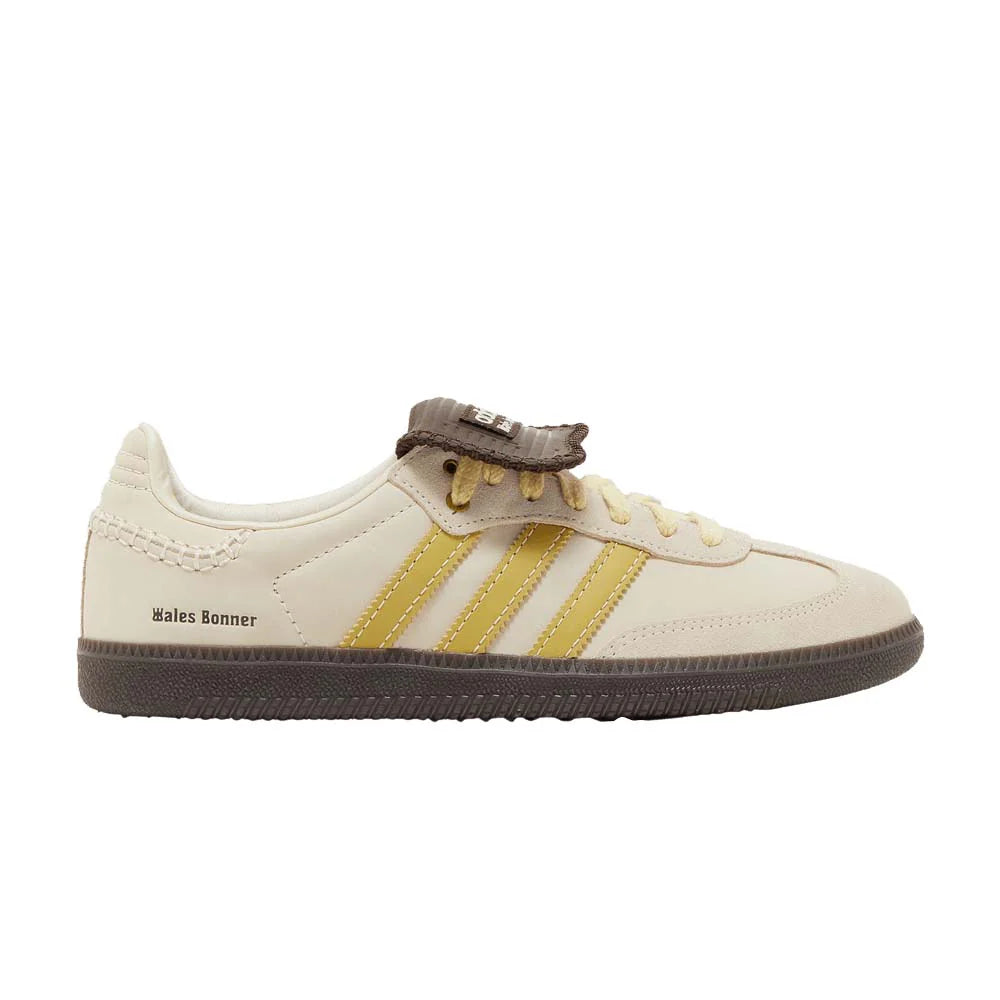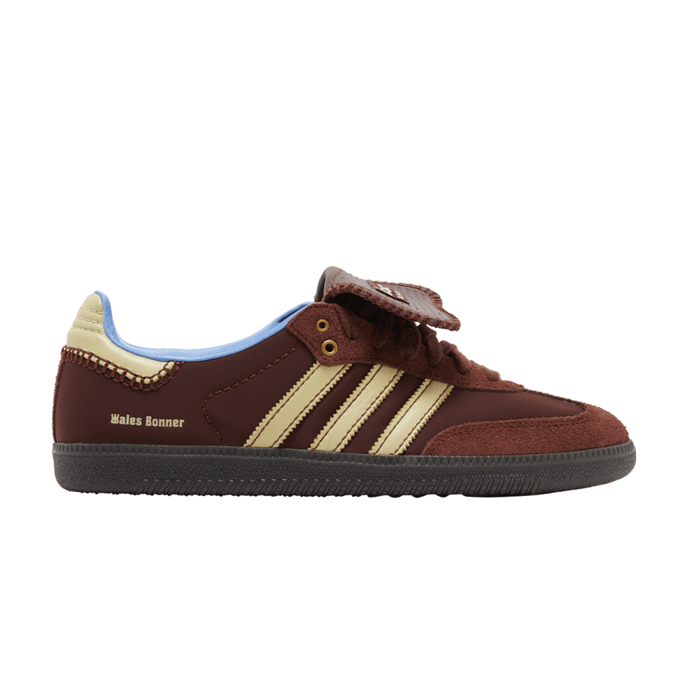Starting with the OG Adidas Sambas, the base material is made from smooth white leather which contrasts to a light brown suede touch on the front of the toe box and a dark brown heel tab. The Iconic Adidas 3 stripes match to the hue of the back tab, both on the inner and outer side of the sneakers. Based on top of a gum rubber sole, a blue Adidas emblem sits on the tongue tag and stands out against the neutral hues.