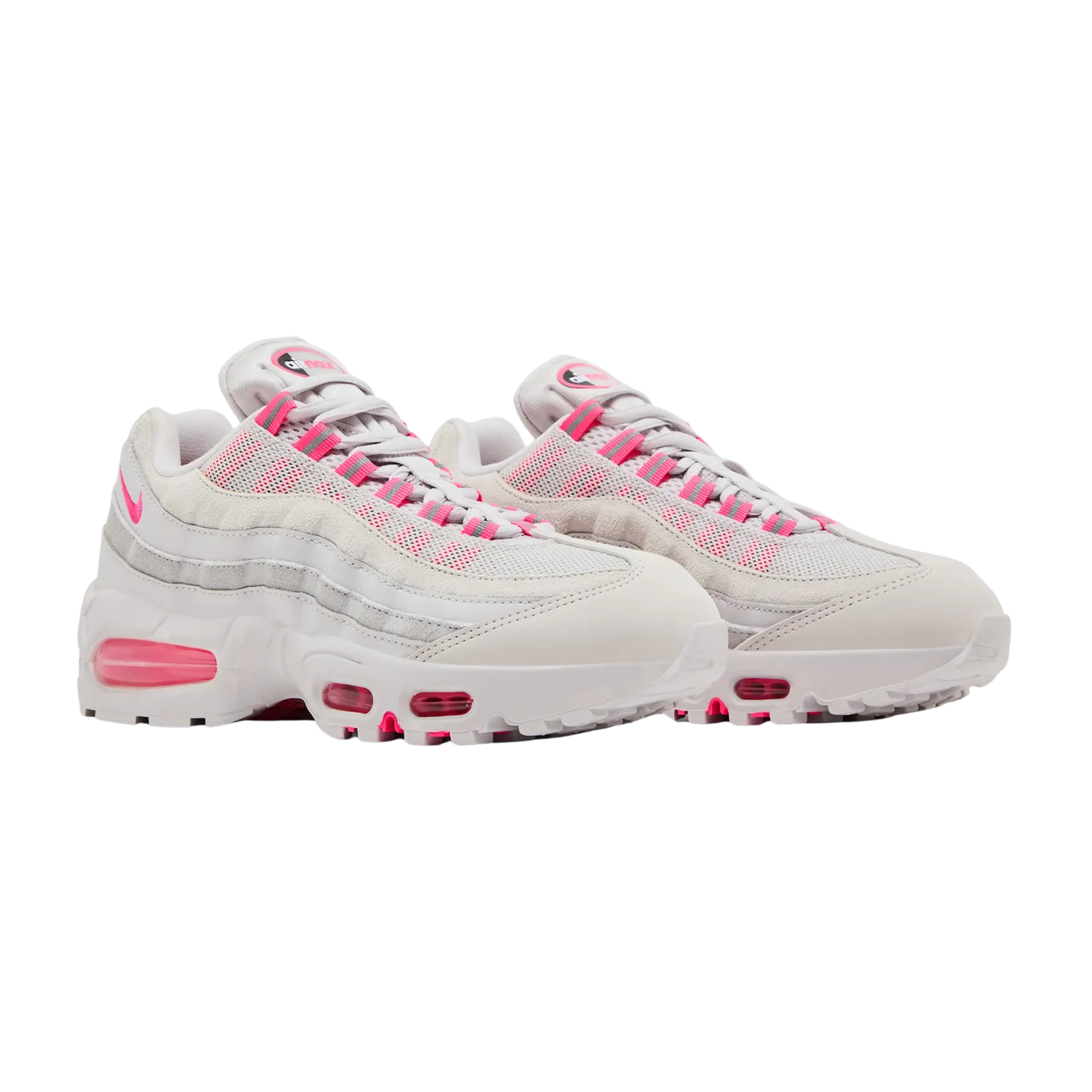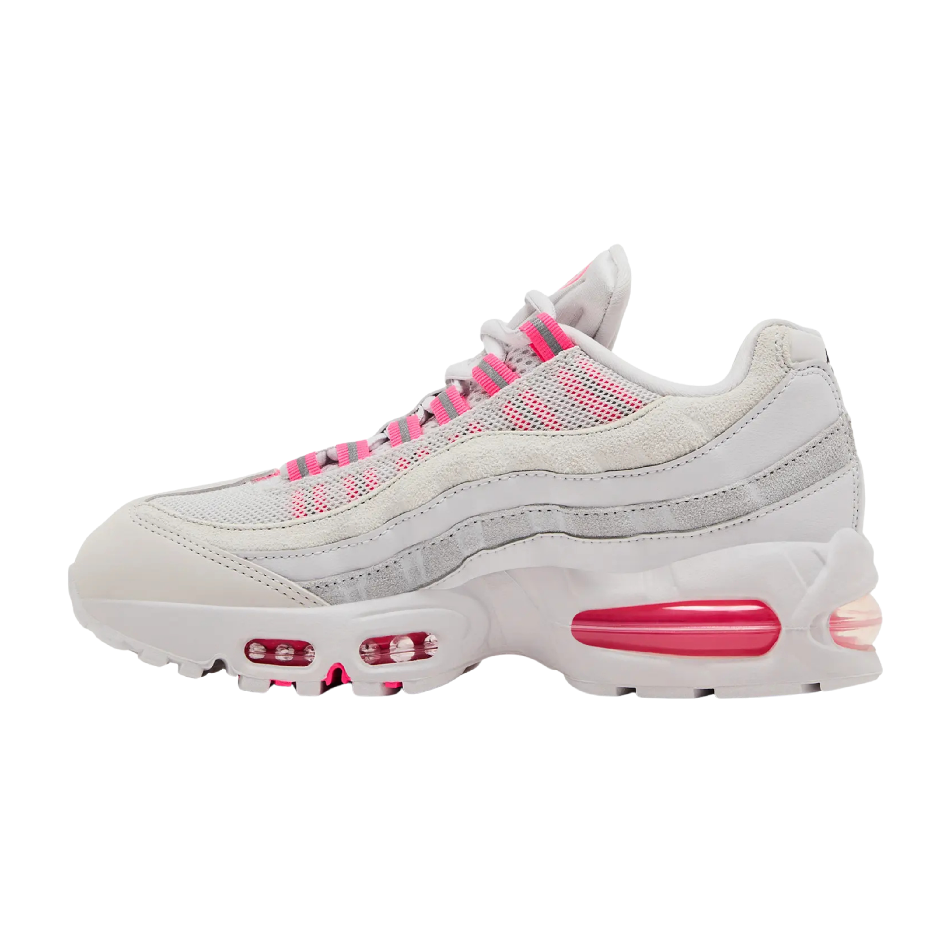 The upper combines real and synthetic leather with breathable mesh panels through the midfoot and tongue. Cream and grey shades form the base, while Hyper Pink details appear on the lace loops and branding. The signature wave-style side panels remain, staying true to the Air Max 95’s original design.