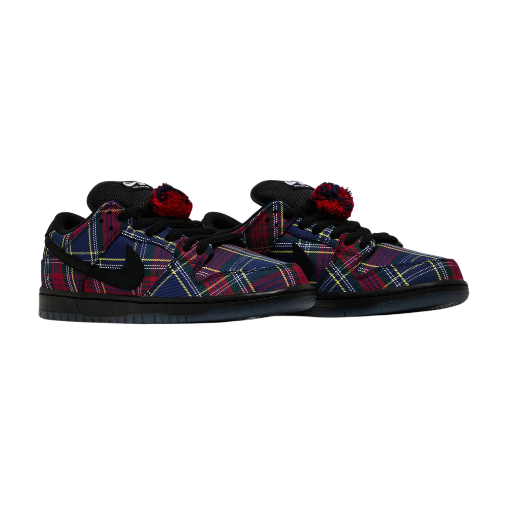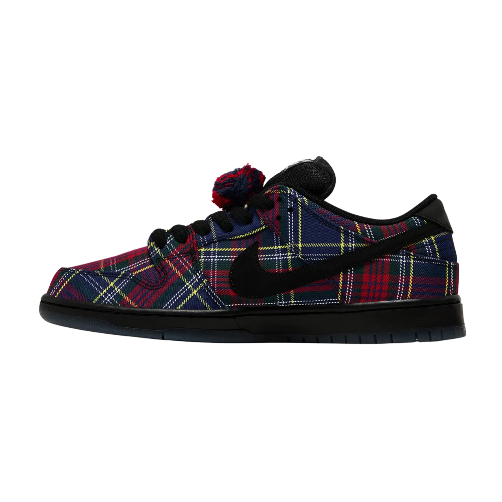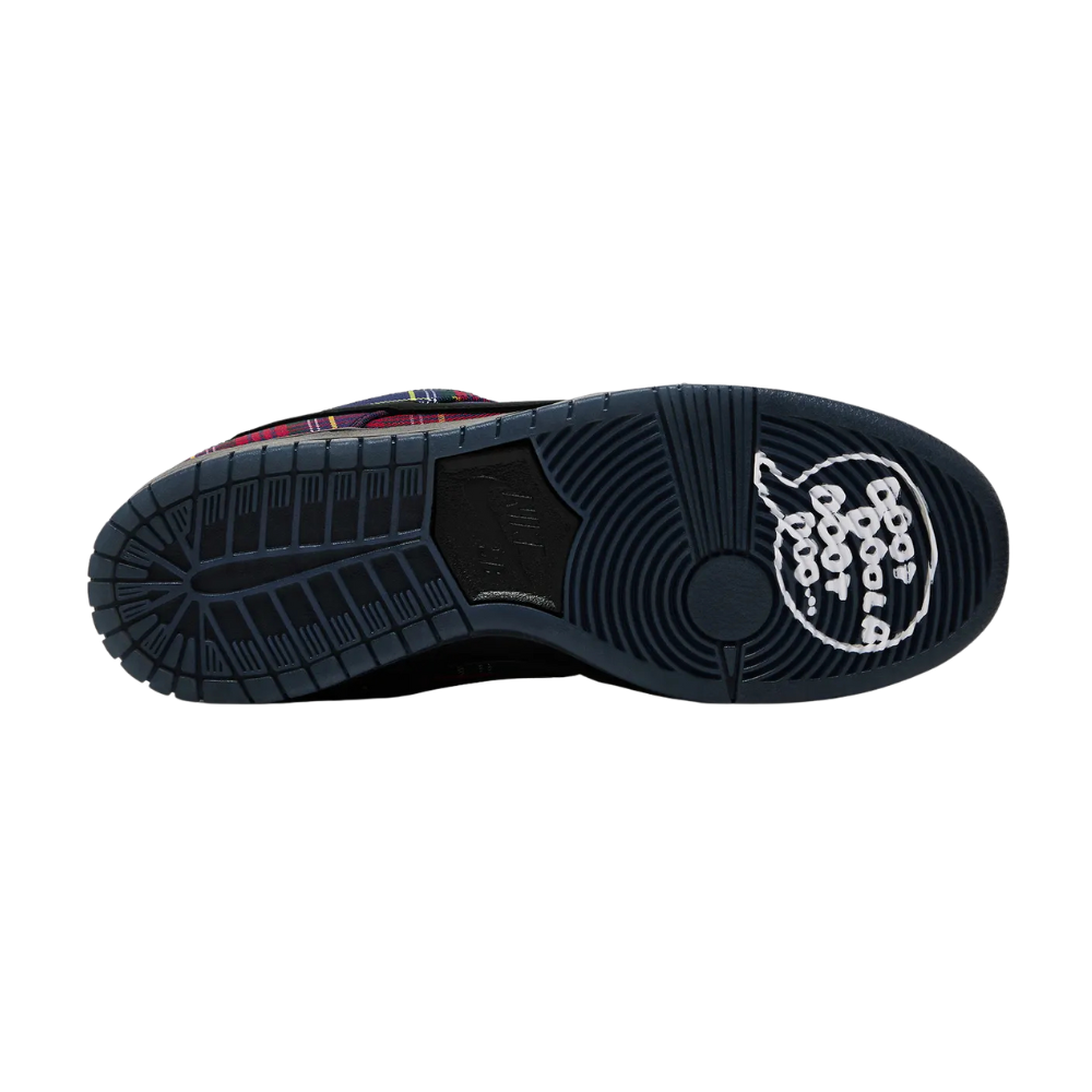 Nardwuar, also known as "The Human Serviette," teams up with Nike Skateboarding to deliver his very own Dunk Low silhouette. Just like Nardwuar's favourite hat, this Nike SB features a multi-coloured tartan plaid base and a detachable pom-pom near the laces. Arriving laced in black, you can mix it up with the five spare sets of laces in purple, yellow, red, and green that come with this release. Hidden details such as "Doot Doola Doot Doo... Doot Doo!" written on the translucent outsoles, the back heel of the sneaker, and even an exclusive hand card inside the box, make this drop like no other.