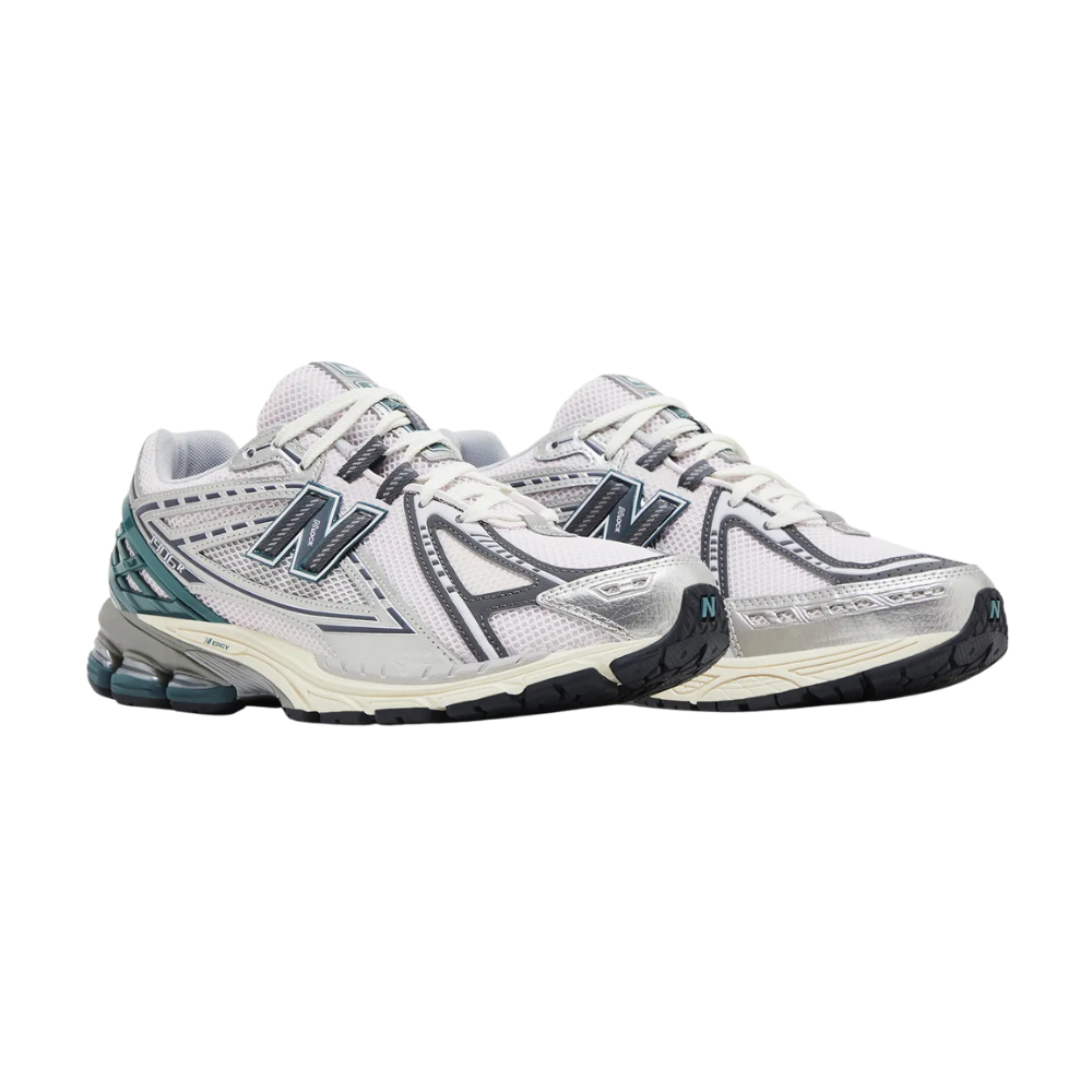 The Silver Metallic overlays keep everything structured, while the Bold New Spruce teal accents across the heel and back midsole area add a clean, minty fresh contrast.