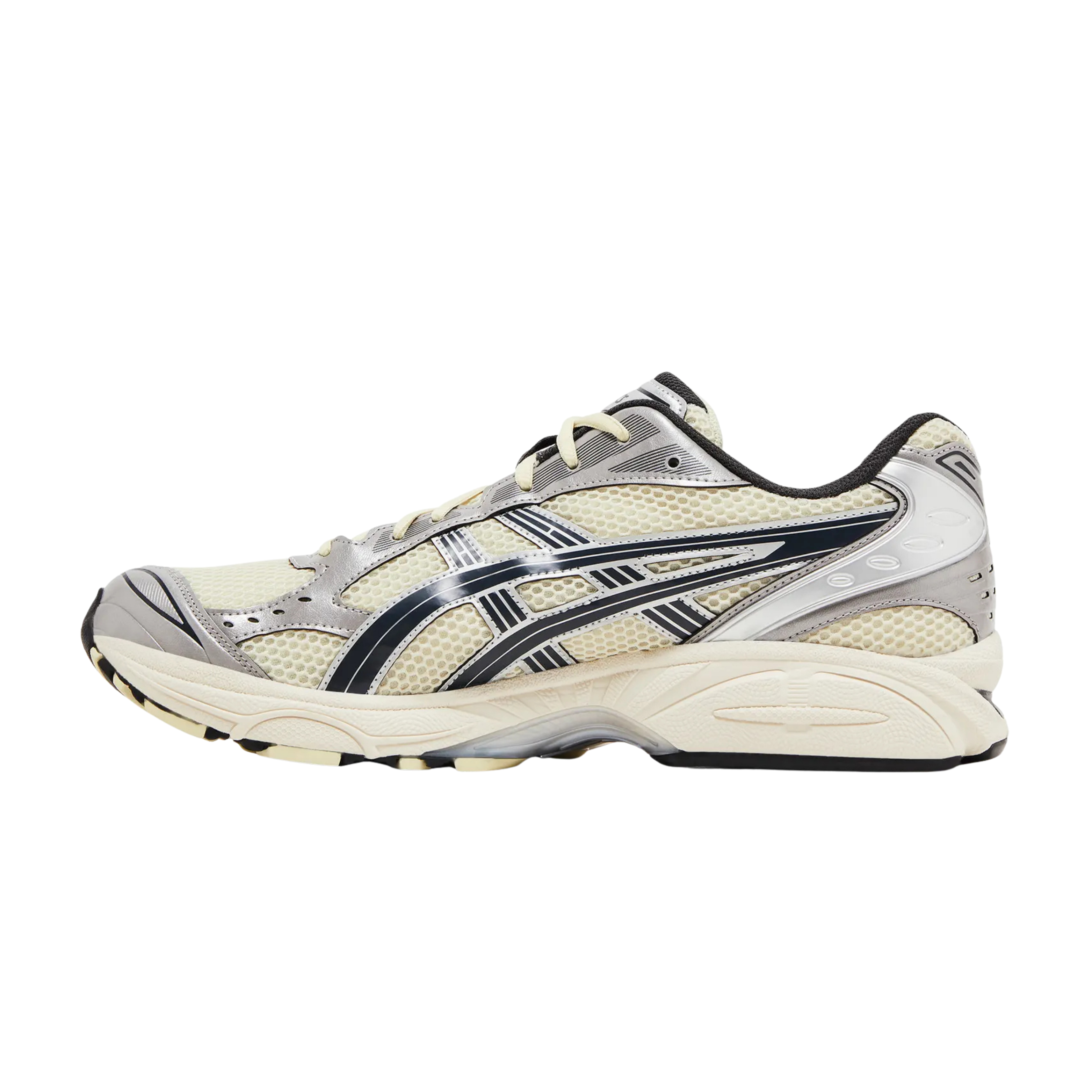 It’s built on a crisp white mesh upper that feels light and breathable, paired with deep grey overlays that give the shoe its structure and shape. The ASICS stripes come through in black, outlined in grey to keep things sharp without being outgoing. Cream laces sit on top of a matching cream midsole, tying the whole palette together to perfection.
