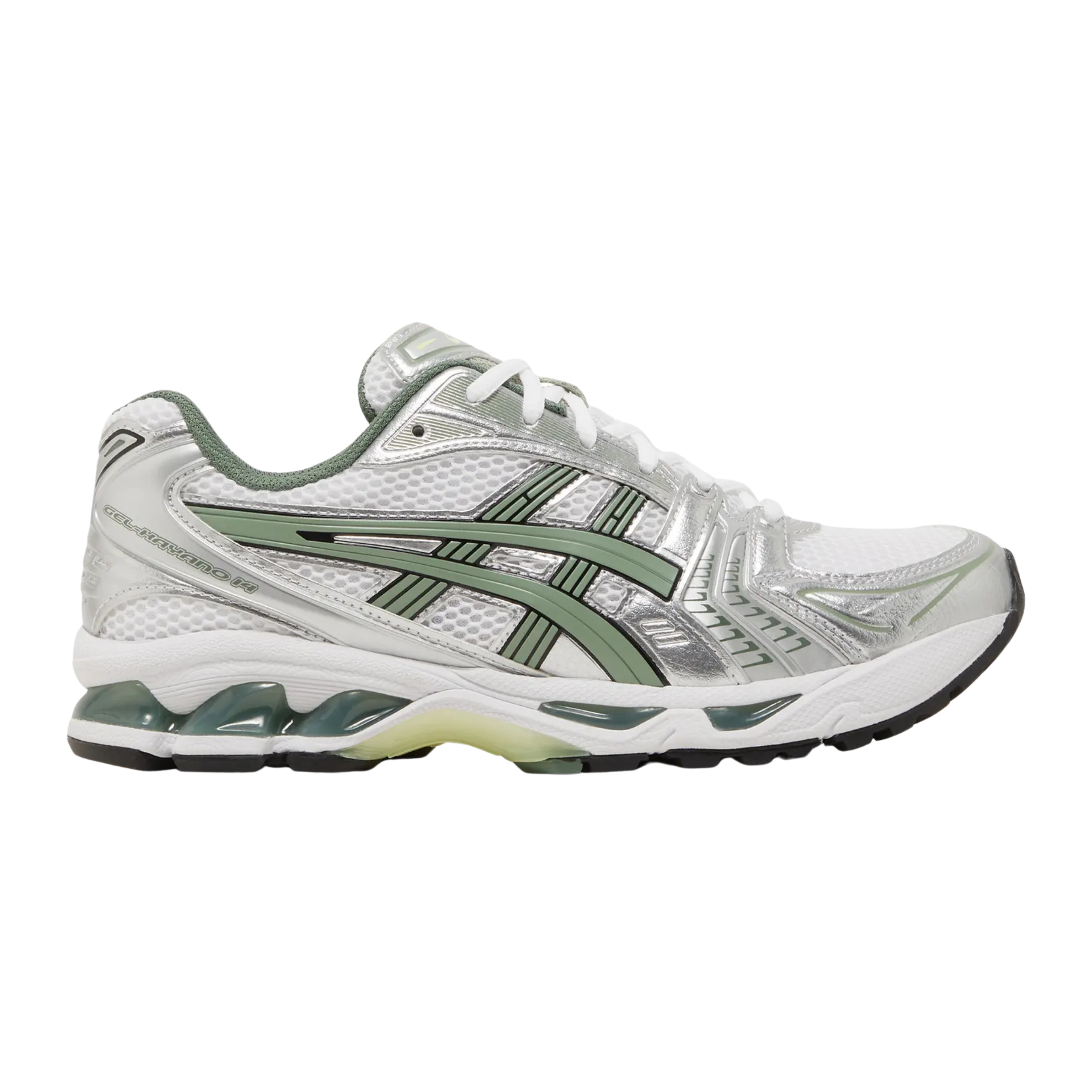 Finishing details include white laces, green Gel-Kayano 14 branding, and lime green ASICS branding on the tongue, which sits on a mesh base with a synthetic leather overlay. Inside, green foam padding ties the colour story together while adding comfort around the collar.