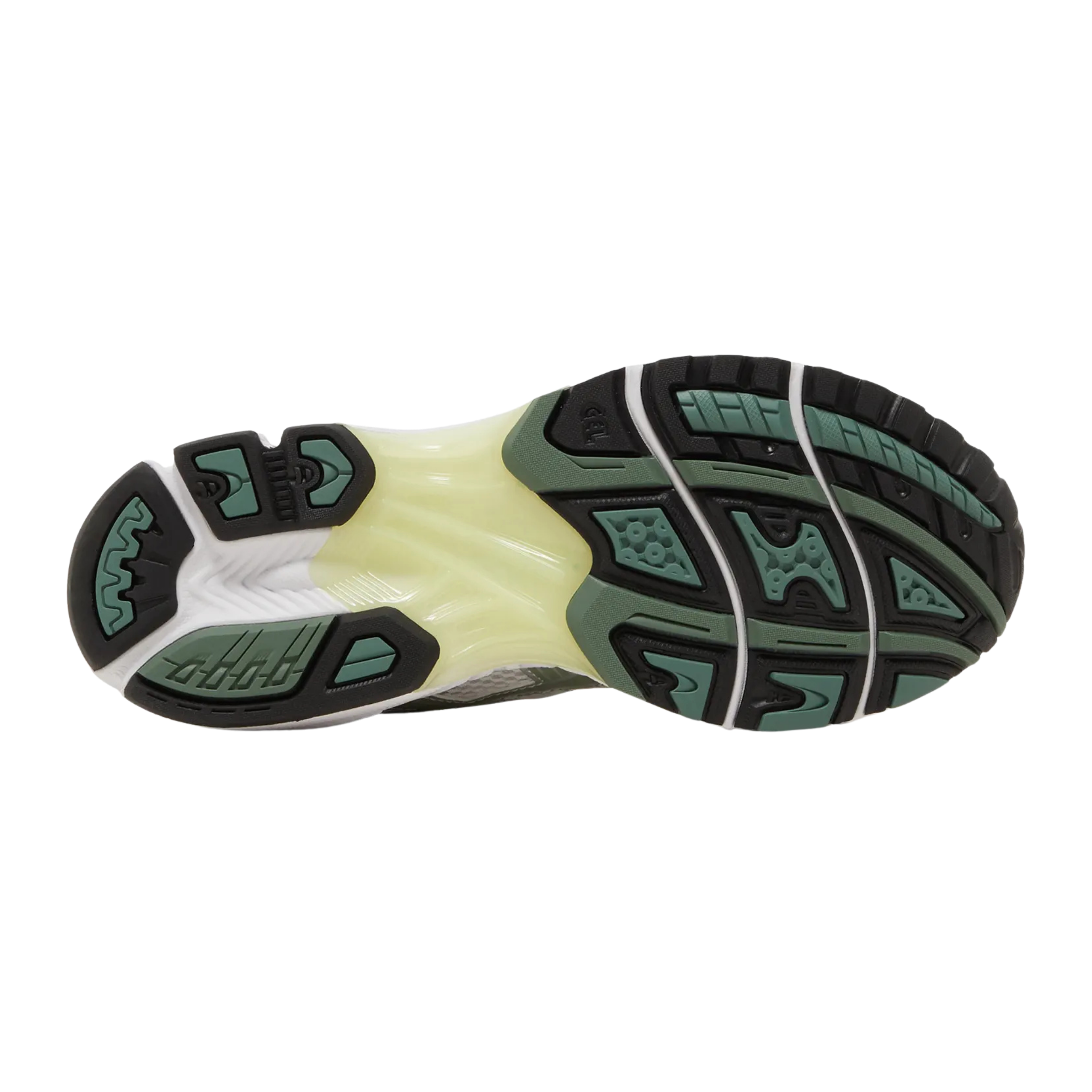 A breathable white mesh base forms the foundation of the upper, layered with silver synthetic leather overlays and structured TPU accents that give the silhouette its signature depth and support. Subtle hits of green run throughout, adding contrast without taking away from the neutral palette.